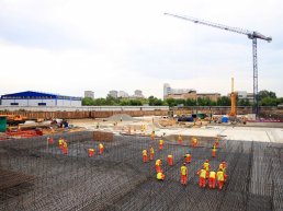 Кроме того, строители приступили к армированию конструкций цокольного этажа южного корпуса. Одновременно с этим осуществляются работы по монтажу бетонной подготовки, гидроизоляции и стяжки на площадке будущей парковки.