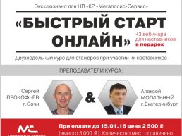 В период с 15 по 29 января для стажёров офисов КР «Мегаполис-Сервис» будут проходить заочные обучающие занятия «Быстрый старт ОНЛАЙН. I ступень». Преимуществом данного курса является то, что дистанционное участие в нём смогут принять сотрудники любого АН, входящего в структуру партнерства. Авторами эксклюзивных вебинаров выступают С. Прокофьев и А. Могильный.