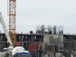 Армирование конструкций на третьем этаже стартовало в секции номер 1. В секции номер 2 обустроен второй этаж, в секции номер 3 выполнено бетонирование второго этажа. В четвертой секции заканчиваются опалубочные работы на четвертом этаже. В подвальной части монолитного здания обеспечивается гидроизоляция.