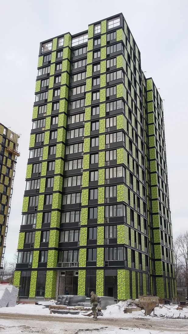 Параллельно в первом и втором корпусе производится облицовка фасада. В третьем корпусе обустраиваются общественные зоны. В корпусах под номерами 4 и 5 ведутся работы в подвале, монтируются фасадные панели.